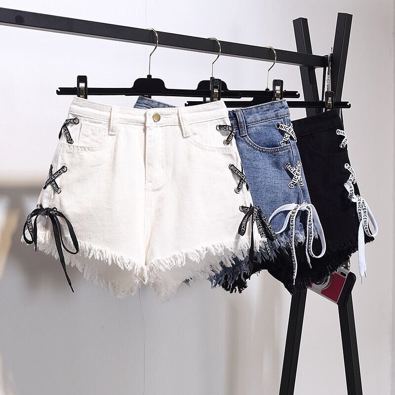 Women Denim Shorts High Waist Lace Up